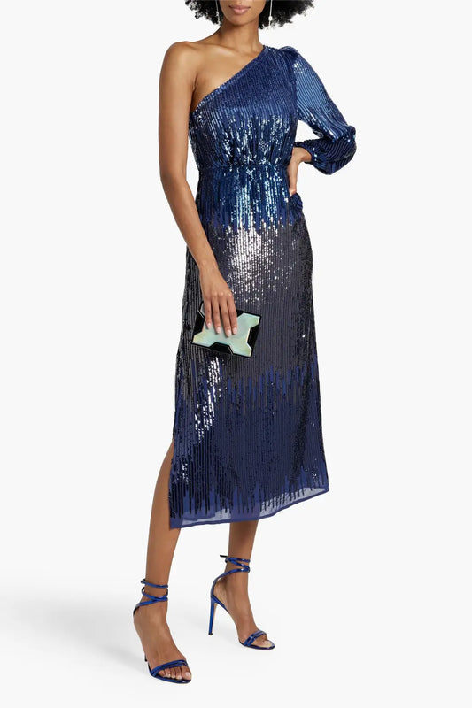 Eenmouwige midi-jurk van chiffon met pailletten en dégradé